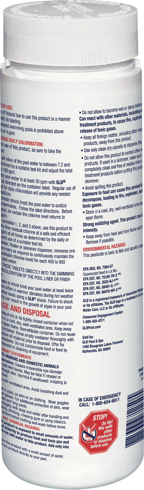 GLB® 1“ tablets provide continuous disinfection. Use in floaters, feeders and skimmers.