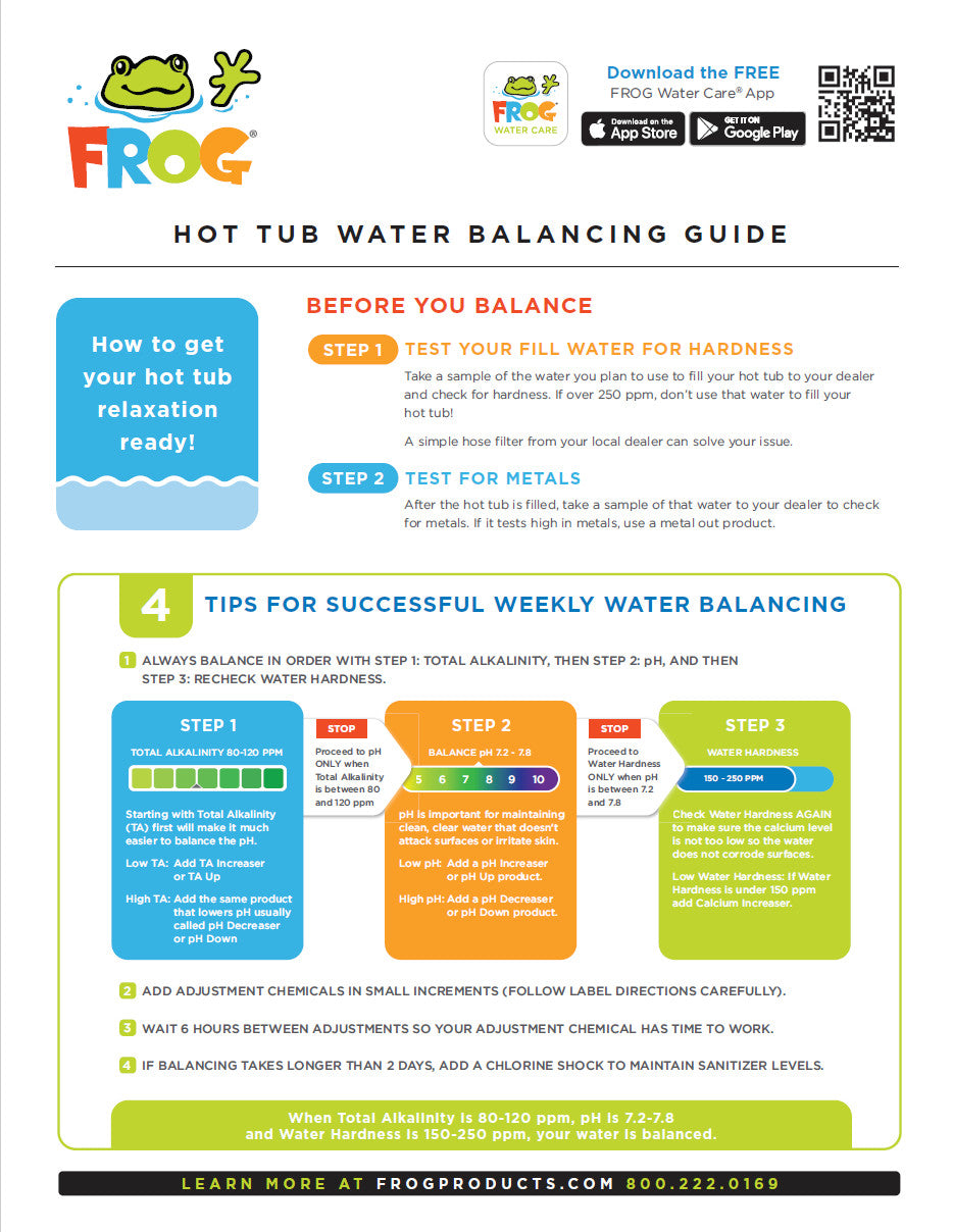 Add FROG Jump Start immediately after filling your hot tub to establish a baseline chlorine level and optimize the performance of all FROG hot tub sanitizing systems. Formulated as a dichlor product, it’s compatible with most hot tub chemicals and water care programs (except biguanides).