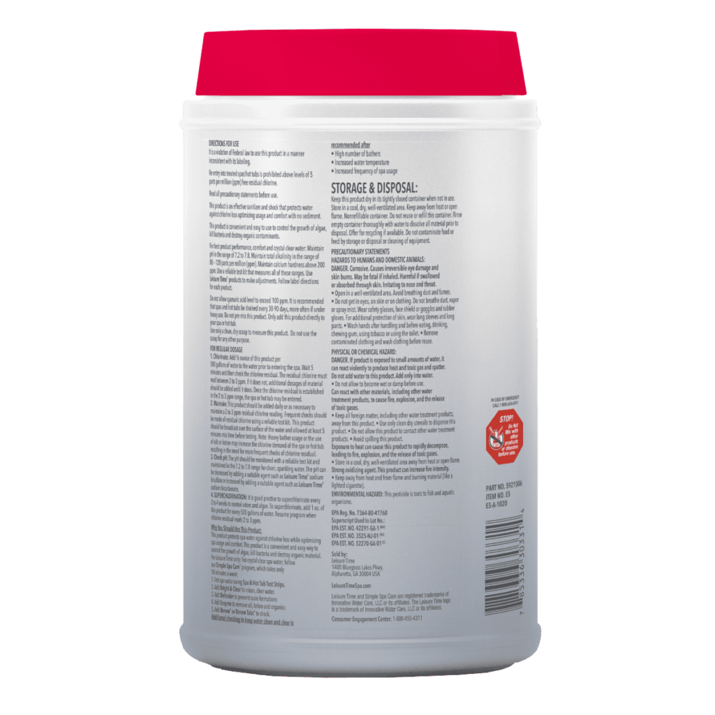 - Convenient and easy-to-use Leisure Time Spa 56 Chlorinating Granules provides clear water so you can enjoy more relaxation